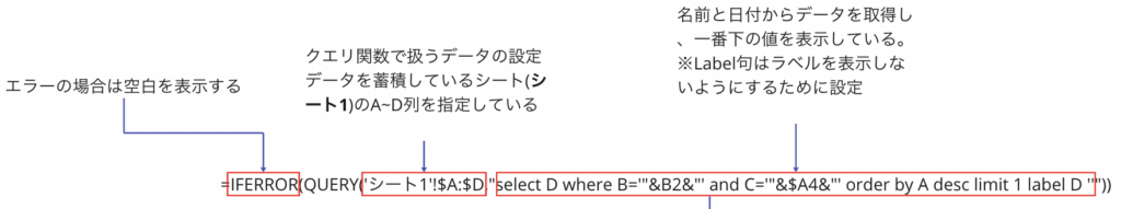 =IFERROR(QUERY(‘シート1’!$A:$D,”select D where B='”&B2&”‘ and C='”&$A4&”‘ order by A desc limit 1 label D ””))